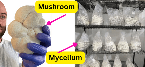 The picture below shows the difference between lion's mane mushrooms vs. mycelium. On the left we have a lion's mane mushroom. The picture on the right shows mycelium... In this stage of growth, no actual lion's mane mushrooms have formed yet. There are no "fruiting bodies"...
